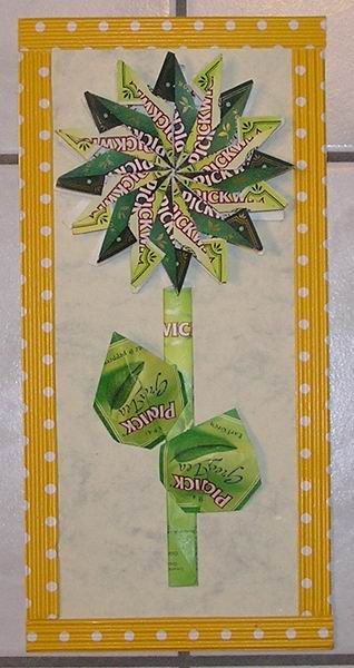A teatasakokból vágott négyzet, vagy téglalap kiszabása után megmaradt kis téglalapokból készített virág.
