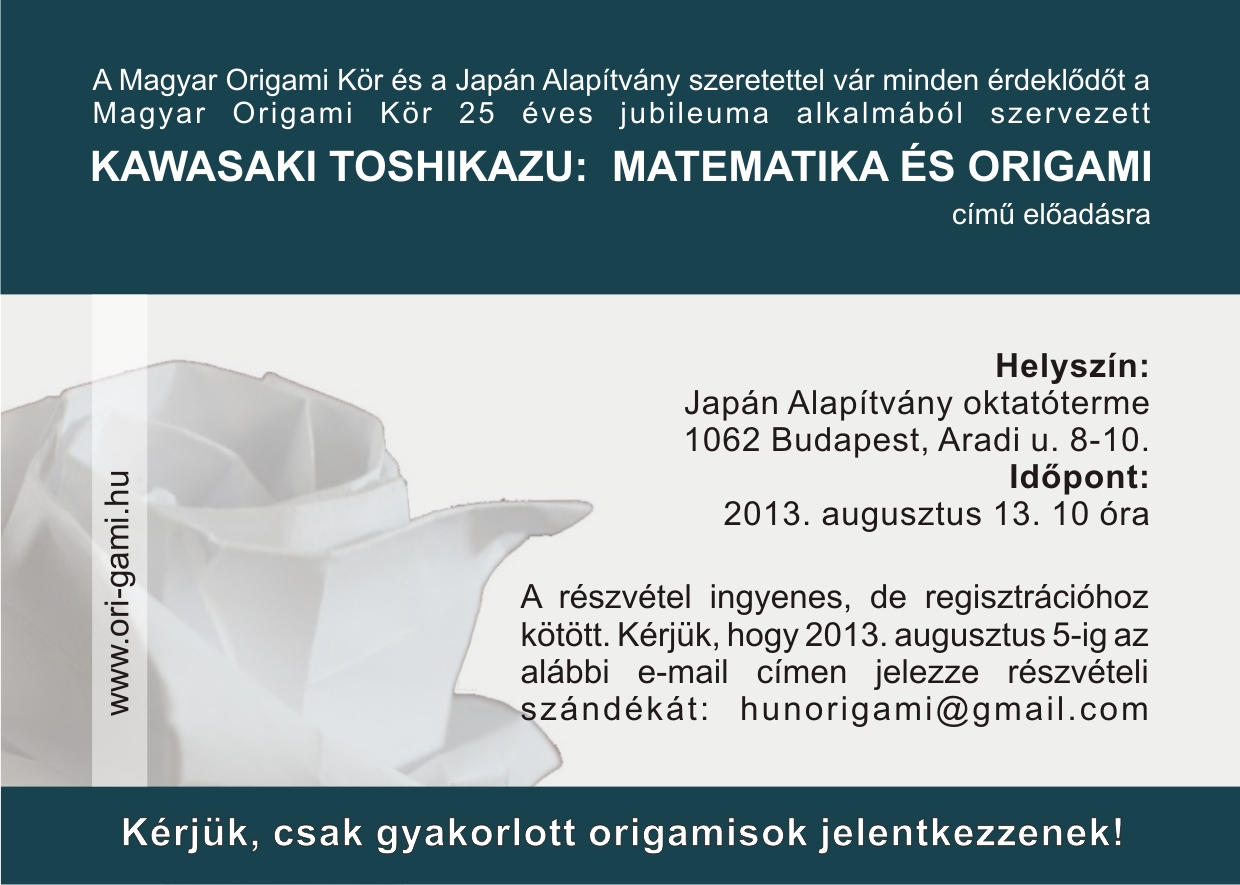 A Magyar Origami Kör a Japán alapítvány támogatásával a Kör 25 éves jubileuma alkalmából speciális workshopot szervez matematika és origami témakörben.