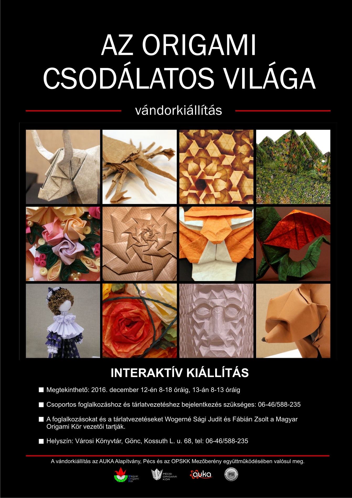 AZ ORIGAMI CSODÁLATOS VILÁGA vándorkiállítás bepillantást enged a papírhajtogatás sokszínűségébe. A látogatók megismerkedhetnek az origami rövid történetével, a ghian-zhi technikával, a kuszudamákkal, a tesszalációval, a papírfajtákkal. Bemutatkoznak a művészeti szekció tagjai, különleges kartonhajtogatásokkal, vizes-technikával és fémhajtással.